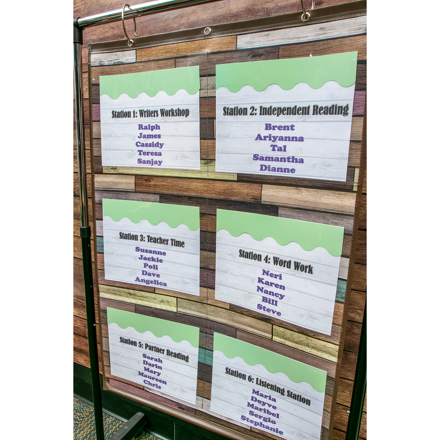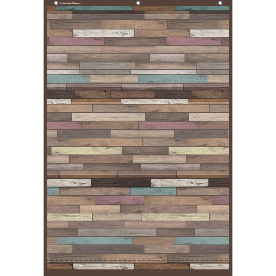 This lightweight and durable Reclaimed Wood Large 6 Pocket Chart features a rustic design and hangs easily from sturdy, metal grommets. Pockets fit 8½" x 11" pieces of paper. The non-porous surface is easy to clean and can be wiped-down or sprayed with disinfectant to help prevent the spread of germs. Measures 26" x 38".