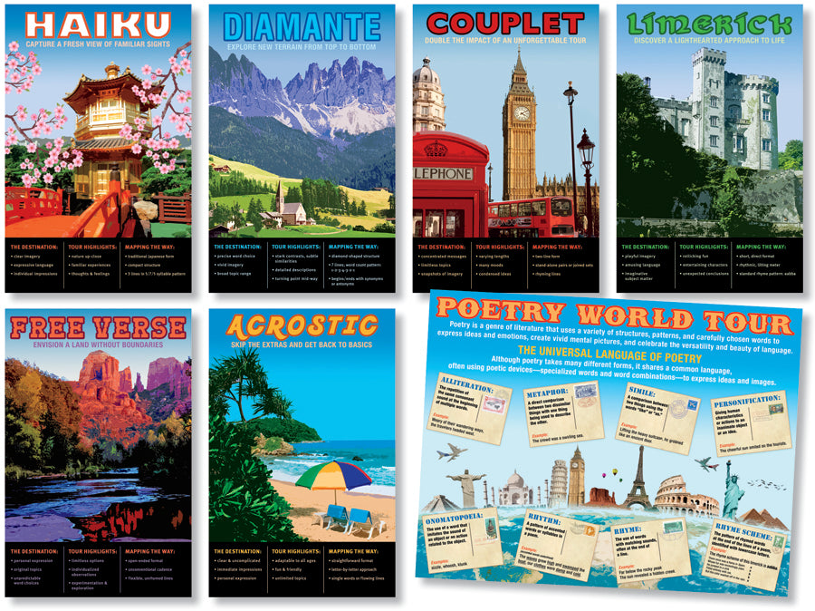 Invite students on an inspiring tour of the colorful world of poetry! Styled after vintage travel posters, this bulletin board set acquaints students with traditional poetic devices and standard poetry forms, highlighting the imagery, language, structure, and mood of each. Includes six 11″ x 17″ (27.9 x 43.2 cm) posters and a 17″ x 22″ (43.2 x 55.9 cm) theme poster. Includes a two-page teacher guide. 7 pieces.