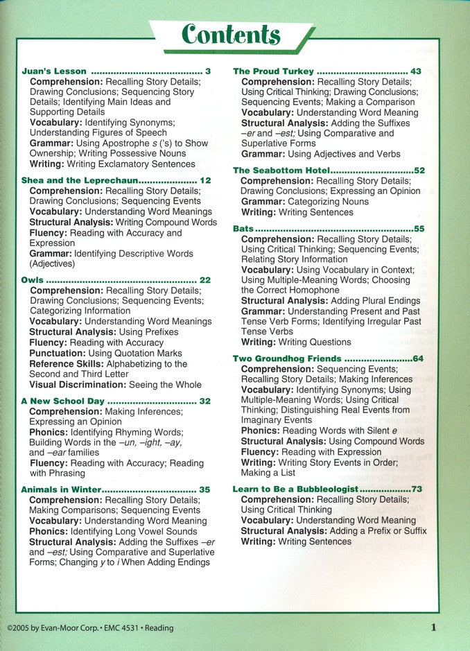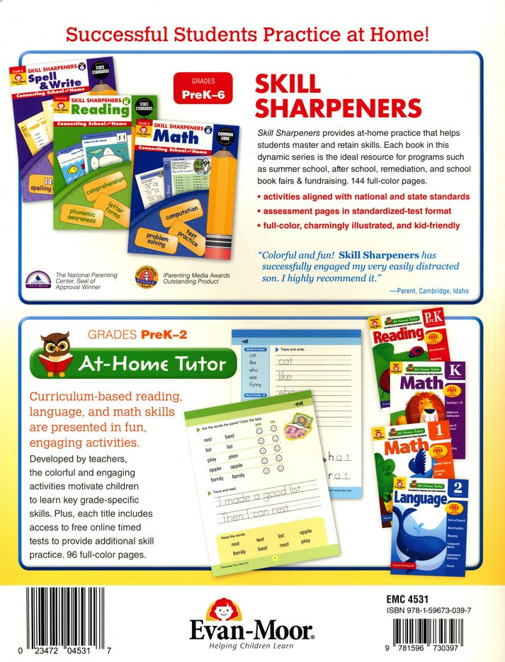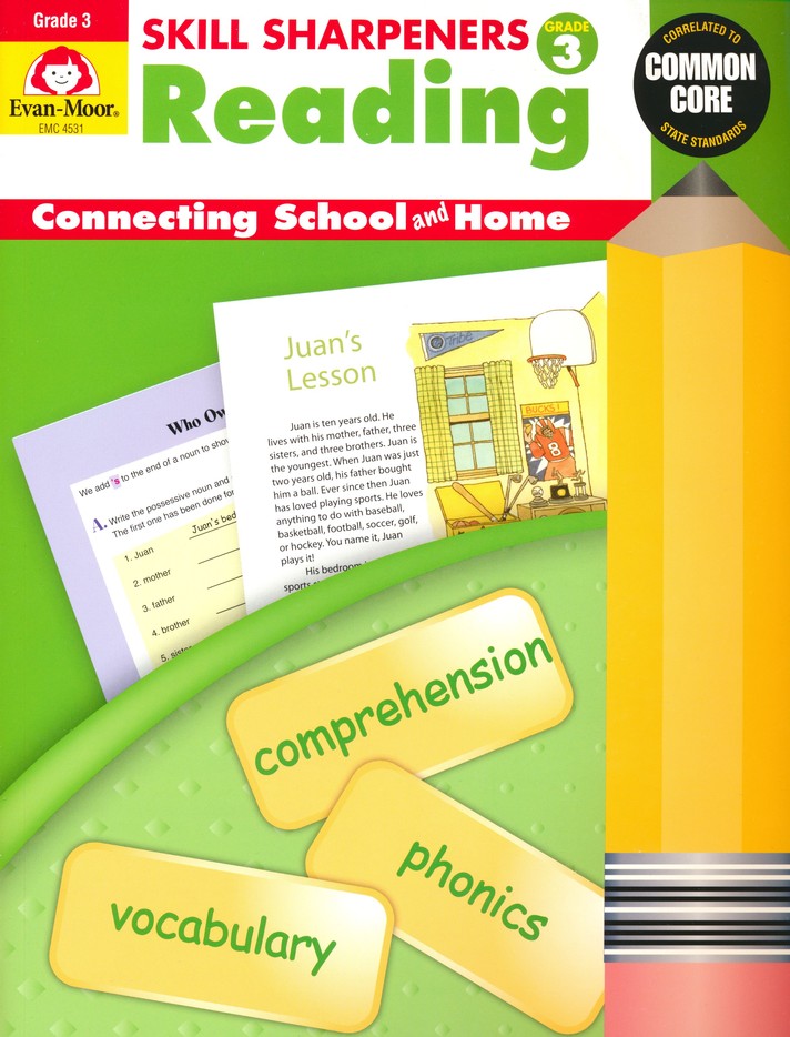 The Skill Sharpeners: Reading series contains engaging full-color stories followed by activity pages that cover a variety of reading skills. Colorful illustrations and activity pages are bright and cheery; stories are fun and cross genres. Through reading, children will learn about reading with accuracy and expression, recalling story details, drawing conclusions, sequencing story details, identifying main and supporting ideas, making inferences, understanding word meanings, writing compound words, alphabetizing to the second and third letter, using compound words, using prefixes, create plural forms, understanding and using contractions, hard and soft vowels sounds, and more. 144 non-reproducible pages, softcover. Answer key included with reduced full-color student pages with the correct answers overlaid. Grade 3.