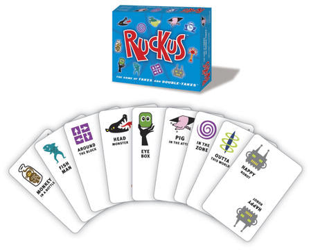 Players create a Ruckus as they race to collect sets in this fast-paced matching card game. Each player starts with seven cards from which sets are quickly formed and placed face-up on the table. Taking an opponents set is easy, just place a matching card from your hand on top and slide the captured set in front of you. But beware, it can be stolen back just as easily.
