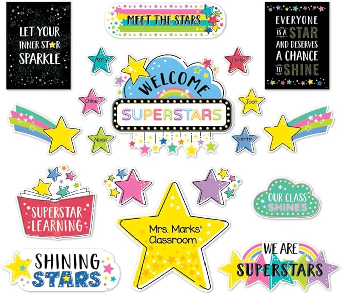 - WHAT’S INCLUDED: This 43-piece bulletin board set includes a welcome banner, 30 student stars, 5 signs, 2 mini posters, and additional star pieces.