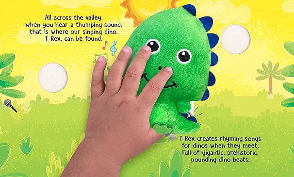Discover the joy of reading and playing with our adorable board book, featuring an attached cuddly plush T-Rex character that sticks right to the cover. Little ones can also affix the little dino plush to each page as they read along.