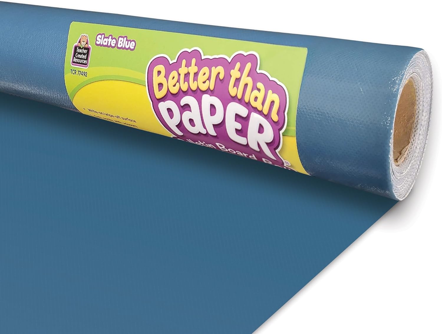 Add some warmth to your classroom with this slate blue color. This revolutionary non-woven fabric makes creating beautiful bulletin board backdrops quick and easy! The lightweight material is simple to hang—no more struggling with paper that wrinkles and tears. Attach border trim, accents, posters, and student work with staples or tape and remove without ripping or leaving conspicuous holes. The durable write-on/wipe-off surface can be used again and again. Roll measures 4' x 12'.