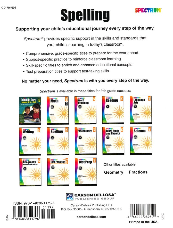 Spectrum's grade-specific workbooks can help reinforce and enhance your student's core educational curriculum. Spectrum Spelling Grade 5 provides focused practice on variant consonants, irregular plural nouns, prefixes and suffixes, and rhyming words. Twenty-two lessons are provided, with a review after every 2-5 lessons.