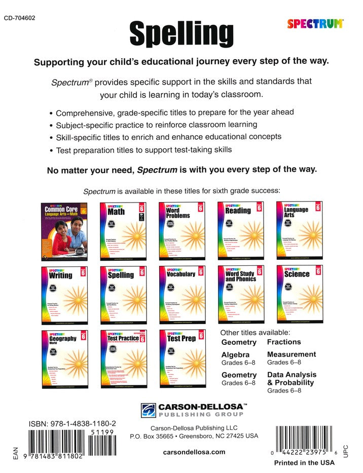 Spectrum's grade-specific workbooks can help reinforce and enhance your student's core educational curriculum. Spectrum Spelling Grade 6 provides focused practice on diphthongs, regular and irregular plurals, related words, and Greek and Latin roots. Twenty-seven lessons are provided, with a review after every 2-5 lessons.