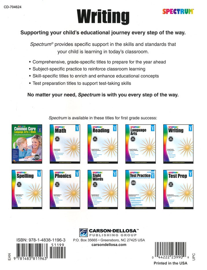 Spectrum's grade-specific workbooks can help reinforce and enhance your student's core educational curriculum. Spectrum Writing Grade 1 provides focused practice to support writing mastery. Students will study the elements of writing a story, writing to inform, and writing an argument. In the process, 1st grade students will learn about facts/opinion/bias, the order of importance, using an outline, taking notes, setting, dialogue, comparing themes, and more.