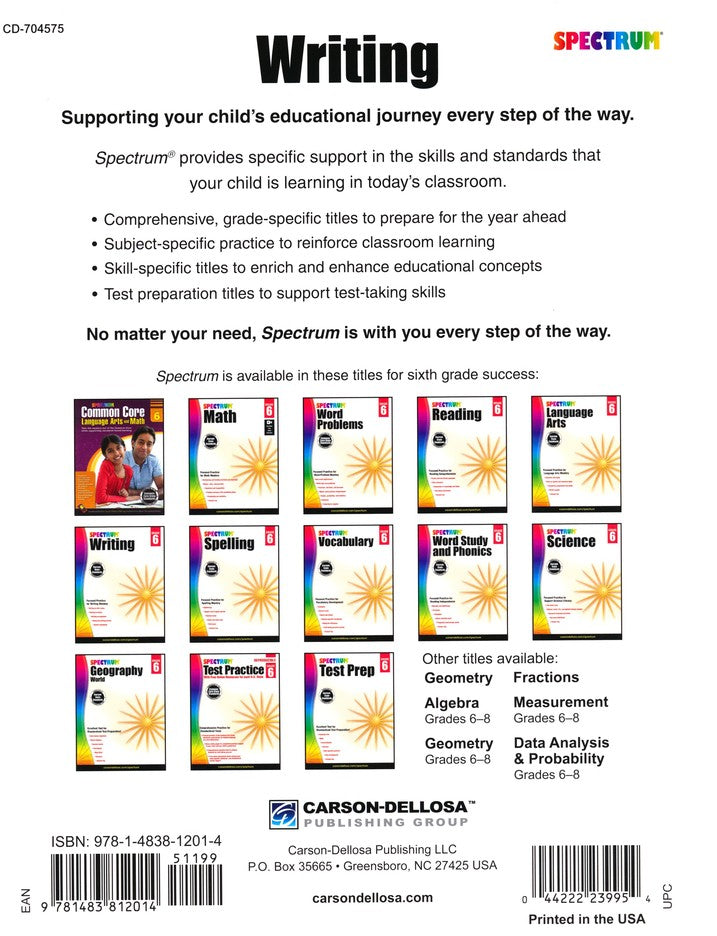 Spectrum's grade-specific workbooks can help reinforce and enhance your student's core educational curriculum. Spectrum Writing Grade 6 provides focused practice to support writing mastery. Students will study the elements of writing a story, writing to inform, and writing an argument. In the process, 6th grade students will learn about facts/opinion/bias, the order of importance, using an outline, taking notes, setting, dialogue, comparing themes, and more.