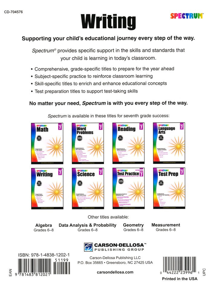 Spectrum's grade-specific workbooks can help reinforce and enhance your student's core educational curriculum. Spectrum Writing Grade 7 provides focused practice to support writing mastery. Students will study the elements of writing a story, writing to inform, and writing an argument. In the process, 7th grade students will learn about facts/opinion/bias, the order of importance, using an outline, taking notes, setting, dialogue, comparing themes, and more.