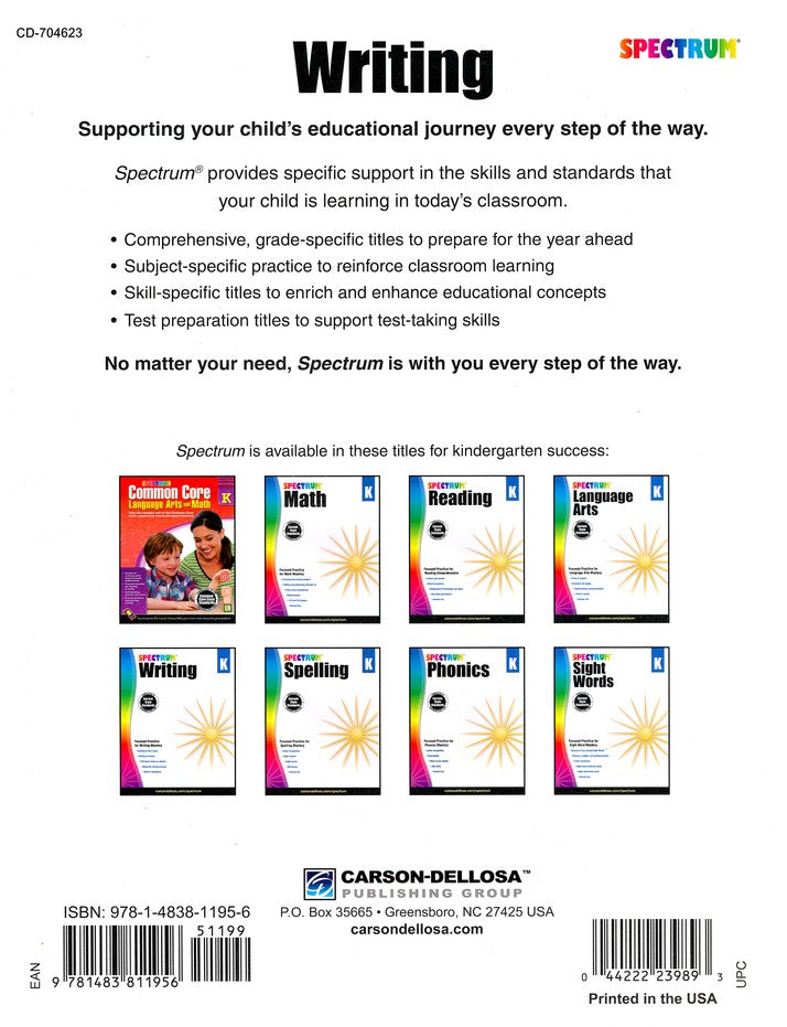 Spectrum's grade-specific workbooks can help reinforce and enhance your student's core educational curriculum. Spectrum Writing Grade K provides focused practice to support writing mastery. Students will study the elements of writing a story, writing to inform, and writing an argument. In the process, kindergarten grade students will learn about facts/opinion/bias, the order of importance, using an outline, taking notes, setting, dialogue, comparing themes, and more.