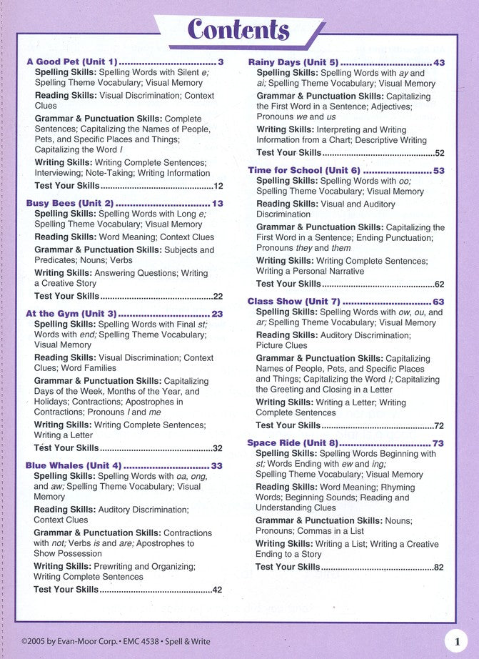 It has been proven that children benefit immensely when parents take an active role in their education. Skill Sharpeners: Spell & Write provides grade-specific practice designed to keep written language skills at the ready! Full-color pages will help children master grade-appropriate spelling, reading, grammar, punctuation, and writing skills through a variety of fun and engaging exercises. Grade 2 specifically covers spelling words with silent e, visual memory, context clues, word families, capitalizing days of the week, months of the year and holidays, apostrophes in contractions, pronouns I and me, commas in a list, creative ending to a story and more. 144 non-reproducible pages, answer key included, softcover. Grade 2.