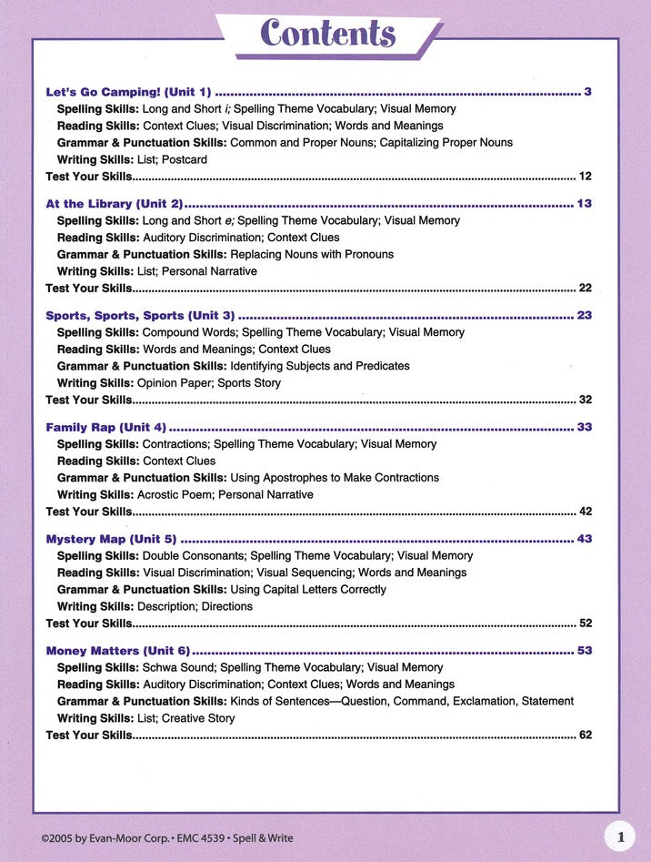 It has been proven that children benefit immensely when parents take an active role in their education. Skill Sharpeners: Spell & Write provides grade-specific practice designed to keep written language skills at the ready! Full-color pages will help children master grade-appropriate spelling, reading, grammar, punctuation, and writing skills through a variety of fun and engaging exercises. Grade 3 specifically covers spelling words, long and short vowel sounds, visual memory, visual and auditory discrimination, common and proper nouns, capitalizing proper nouns, identifying subjects and predicates, using apostrophes to make contractions, writing an acrostic poem and a personal narrative, using context clues, map skills and more. Softcover. non-reproducible pages, answer key included, softcover. Grade 3.