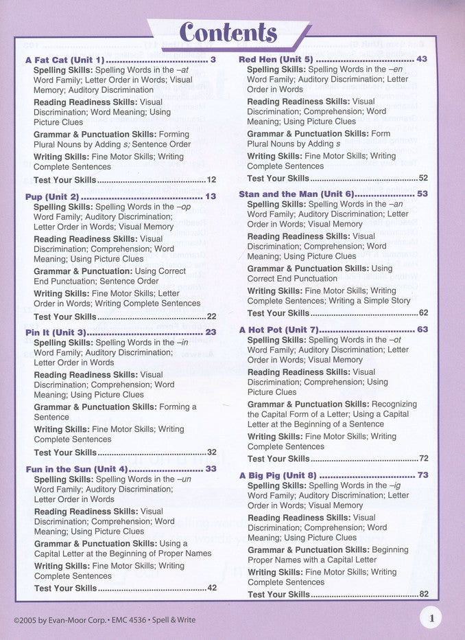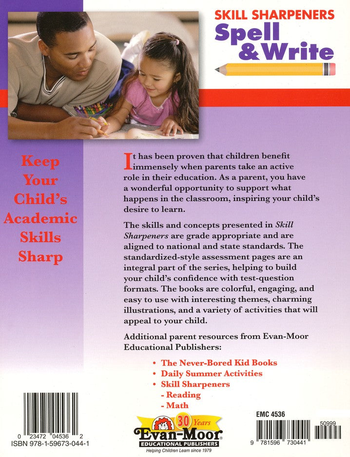 It has been proven that children benefit immensely when parents take an active role in their education. Skill Sharpeners Spell & Write provides grade-specific practice designed to keep written language skills at the ready! Full-color pages will help children master grade-appropriate spelling, reading, grammar, punctuation, and writing skills through a variety of fun and engaging exercises. 144 pages, softcover. Answer key included with reduced student pages and overlaid answers.