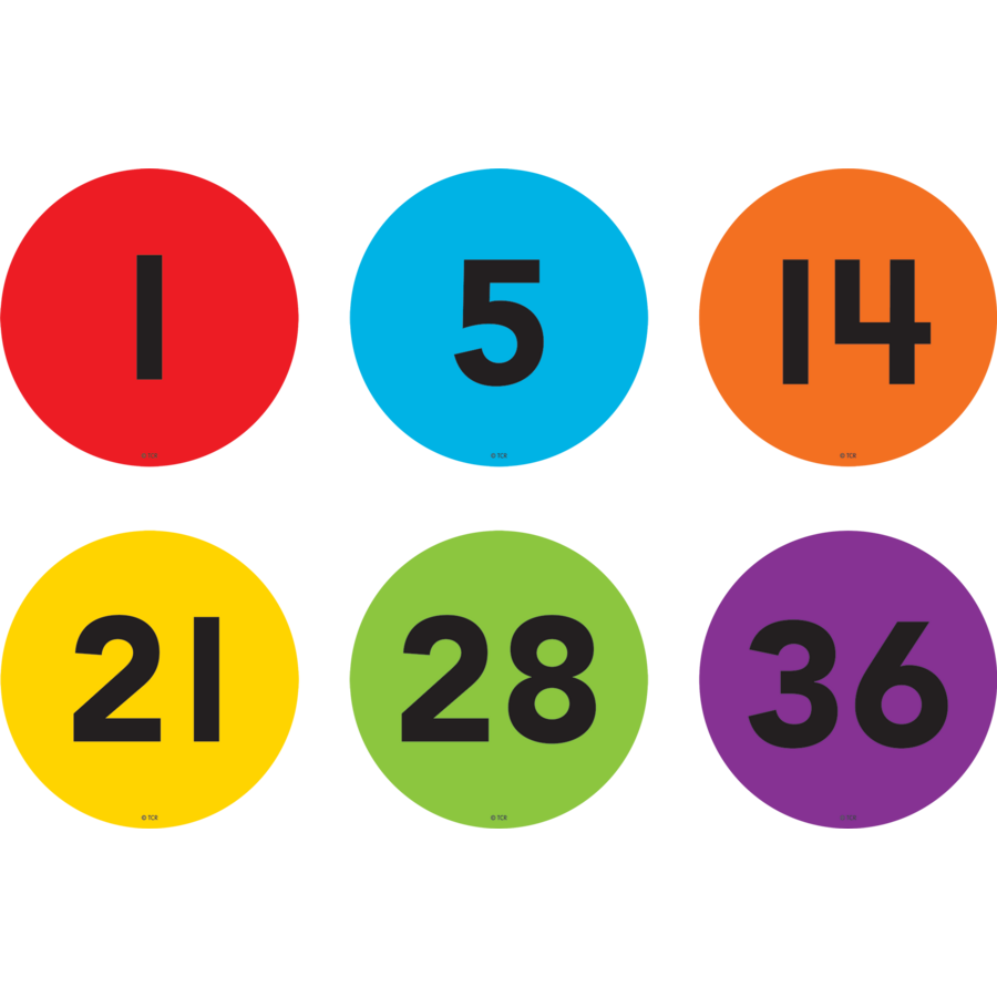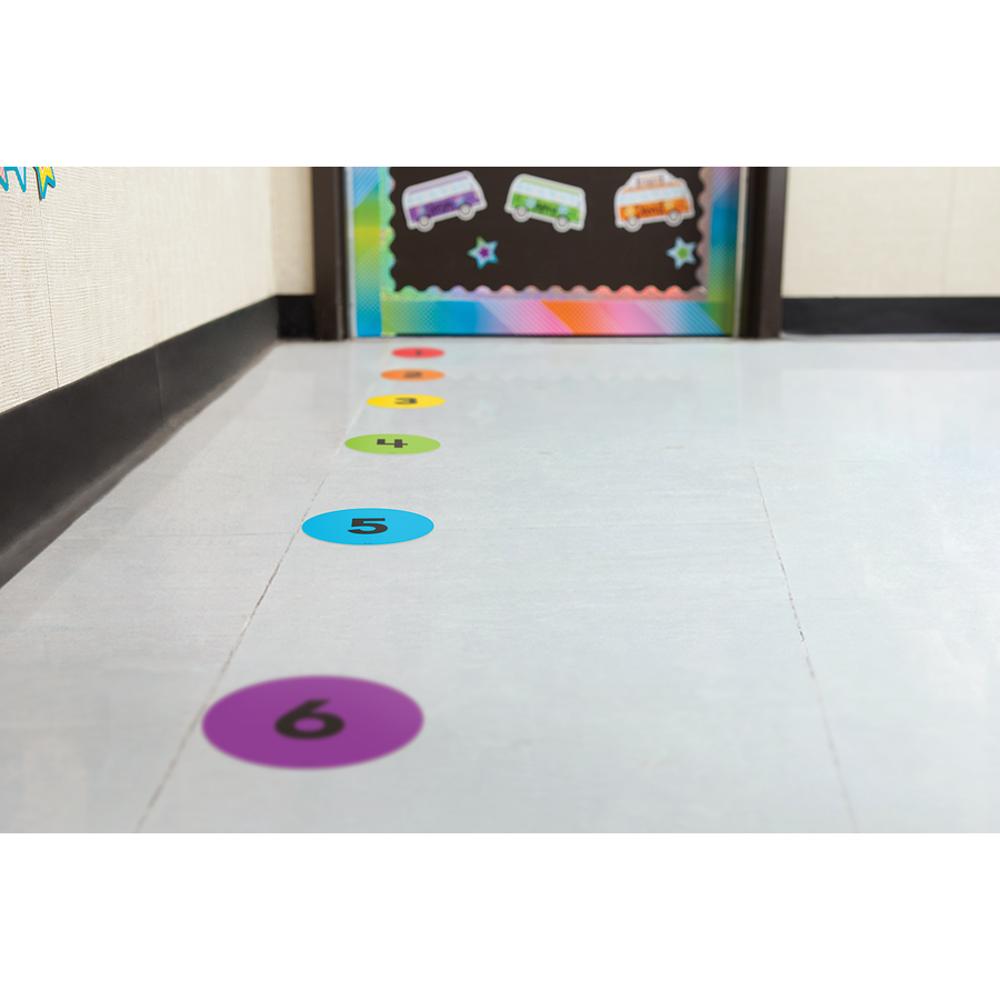 Help students quickly identify where to sit or stand while also getting exposure to numerals. These vinyl floor markers stay on strong but can be removed easily and used again and again. Great for social distancing! The markers attach firmly to smooth, untextured floors and other surfaces. Each marker measures approximately 4" in diameter. 6 colors; 36 pieces total.
