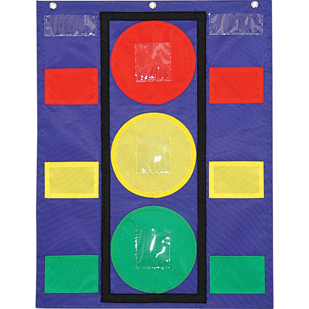 The Stoplight Pocket Chart is ideal for behavior, classroom, and center management as well as differentiating small group assignments! It measures approximately 19.75" x 26" and features: 6 nylon color pockets, 5 clear pockets, 30 write-on/wipe away student sticks, flame retardant material and durable construction, sturdy grommets for easy hanging, and a teacher resource guide.