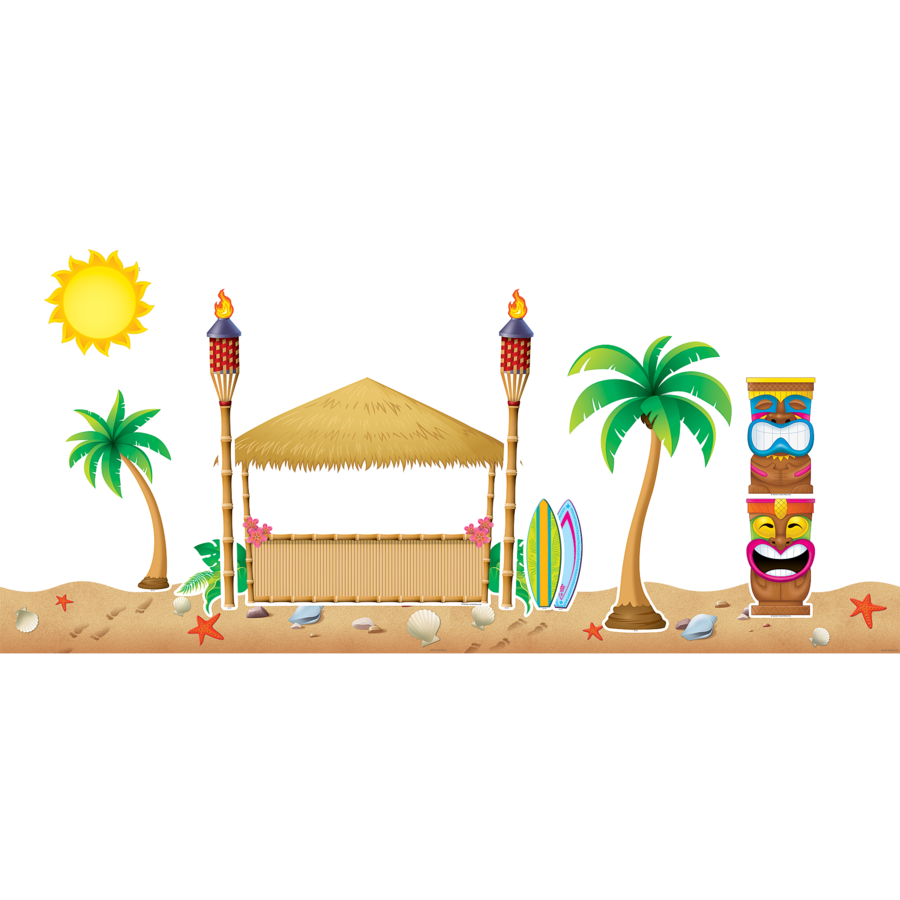 Ride the wave...to a new grade or to new heights of academic achievement. Have some fun as you display student work or classroom information. The hut measures 20¼" x 12¾". Teacher’s guide and 63 pieces, including 43 surfboards.