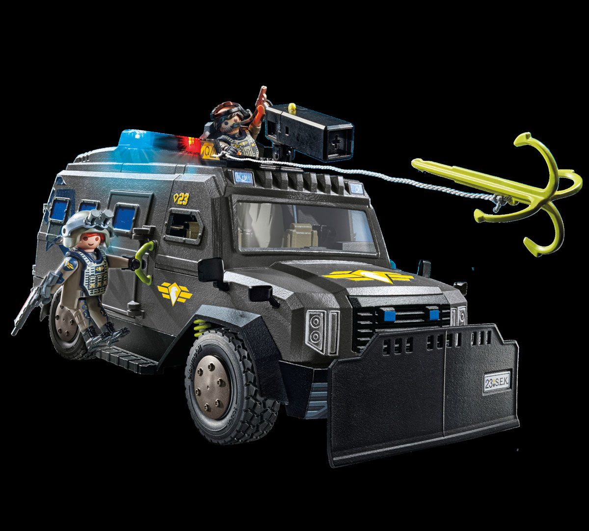 No crook escapes the Tactical Unit - All-Terrain Vehicle! Thanks to the all-wheel suspension, pursuits over rough terrain are no problem for the Tactical Unit. And if the way is blocked, the dozer blade on the front bumper provides a solution. The roof as well as side and rear doors can be opened. On the roof is a mannable tower from which a grappling hook or a water arrow can be fired. With light and sound. Climb aboard the modern Tactical Unit - All-Terrain Vehicle and support the special operations team. With action-packed functions as well as robust vehicles, the new playsets guarantee ever new, exciting missions for all fans of the PLAYMOBIL police.