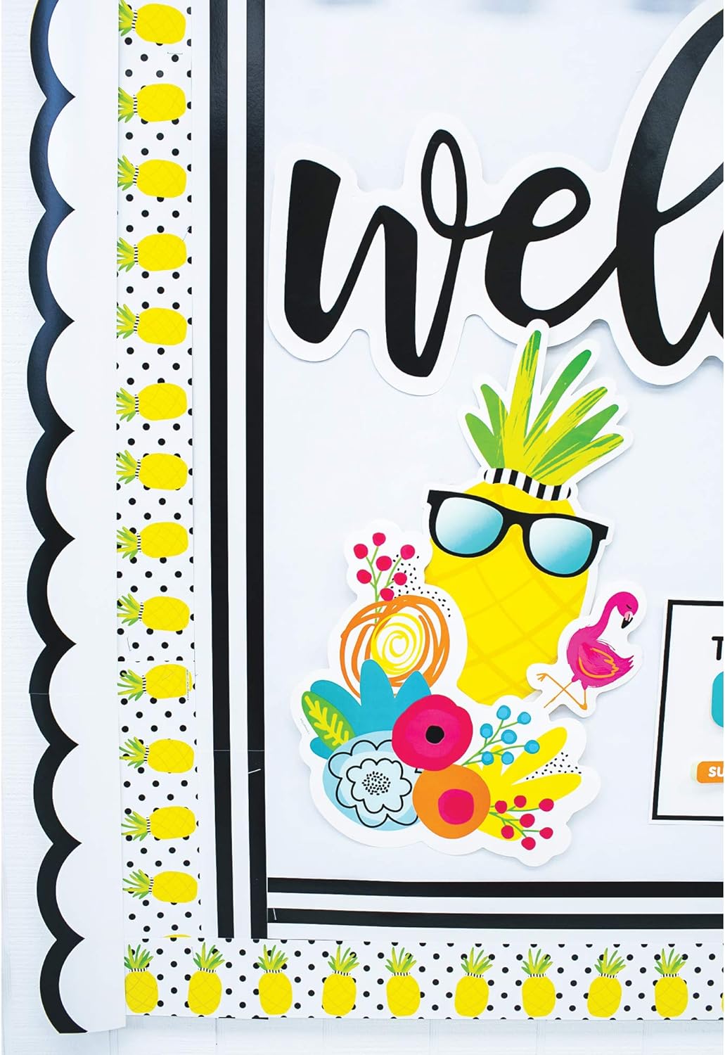 - FEATURES: This eye-catching 25-piece bulletin board features pineapples, flamingos, flowers, tassels, poms, and palm trees.