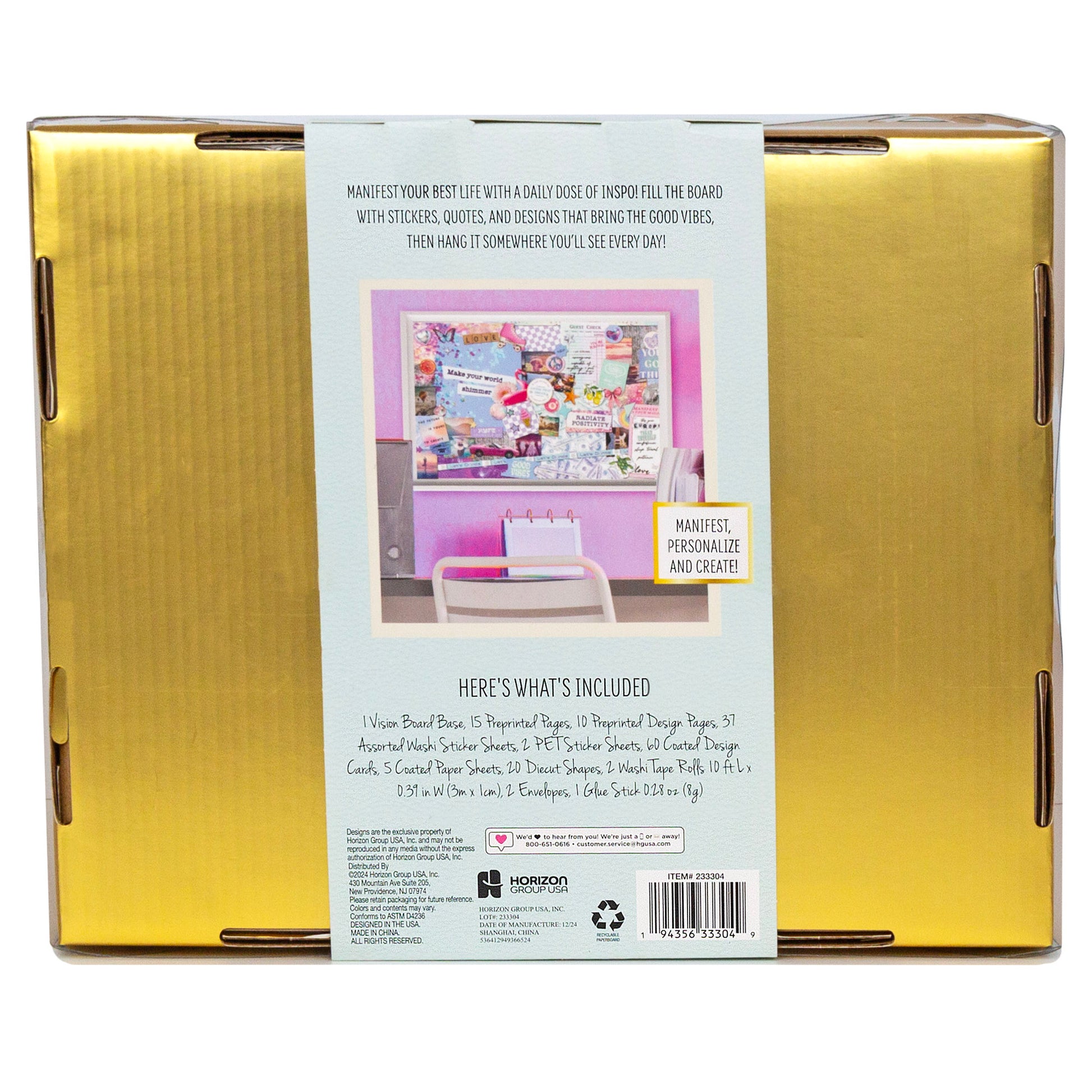 Set Includes: 1 Vision Board Base (17" x 10.5"), 15 Pre-Printed Pages, 10 Pre-Printed Design Pages, 37 Assorted Washi Sticker Sheets, 2 PET Sticker Sheets, 60 Coated Design Cards, 5 Coated Paper Sheets, 20 Die-Cut Shapes, 2 Washi Tape Rolls (10' x 0.39" Each), 2 Envelopes, 1 Glue Stick (0.28oz./8g).