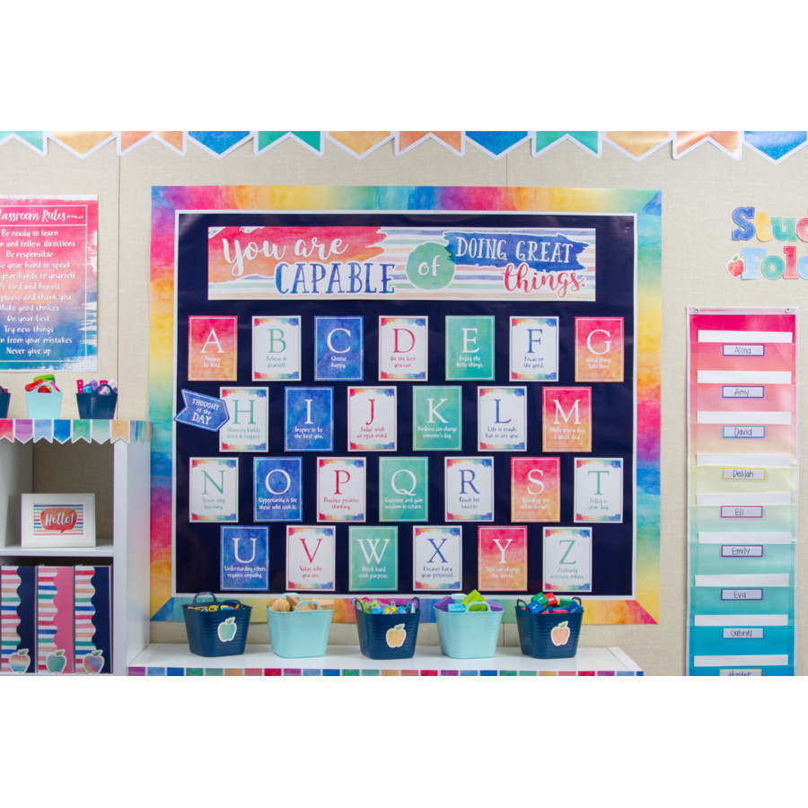 Inspire confidence and promote a growth mindset with this beautiful bulletin board display. Each A to Z mini poster measure 6" x 8" and includes a positive message for students. Header piece measures 48" x 9". 29 total pieces.